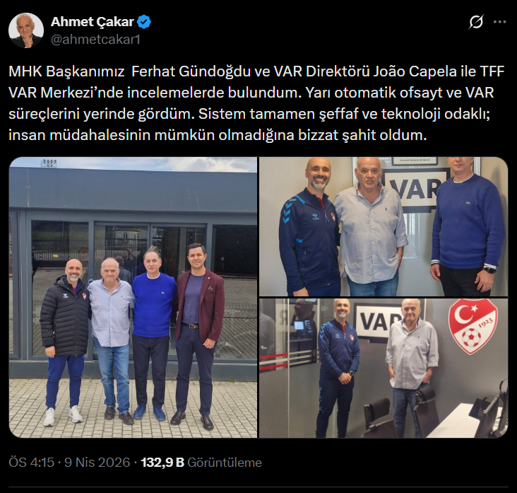 Sosyal medyadan paylaşım yapan Ahmet Çakar, ‘’MHK Başkanımız Ferhat Gündoğdu ve VAR Direktörü João Capela ile TFF VAR Merkezi’nde incelemelerde bulundum. Yarı otomatik ofsayt ve VAR süreçlerini yerinde gördüm. Sistem tamamen şeffaf ve teknoloji odaklı; insan müdahalesinin mümkün olmadığına bizzat şahit oldum’’ ifadelerini kullandı.