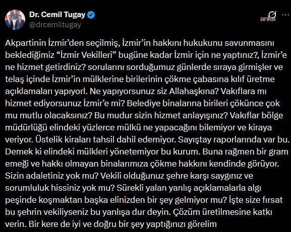 “AK Parti’nin İzmir’den seçilmiş, İzmir’in hakkını hukukunu savunmasını beklediğimiz ‘İzmir vekilleri’, bugüne kadar İzmir için ne yaptınız, İzmir’e ne hizmet getirdiniz sorularını sorduğumuz günlerde sıraya girmişler ve telaş içinde İzmir’in mülklerine birilerinin çökme çabasına kılıf üretme açıklamaları yapıyorlar. Ne yapıyorsunuz siz Allah aşkına? Vakıflara mı hizmet ediyorsunuz, İzmir’e mi? Belediye binalarına birileri çökünce çok mu mutlu olacaksınız? Bu mudur sizin hizmet anlayışınız?