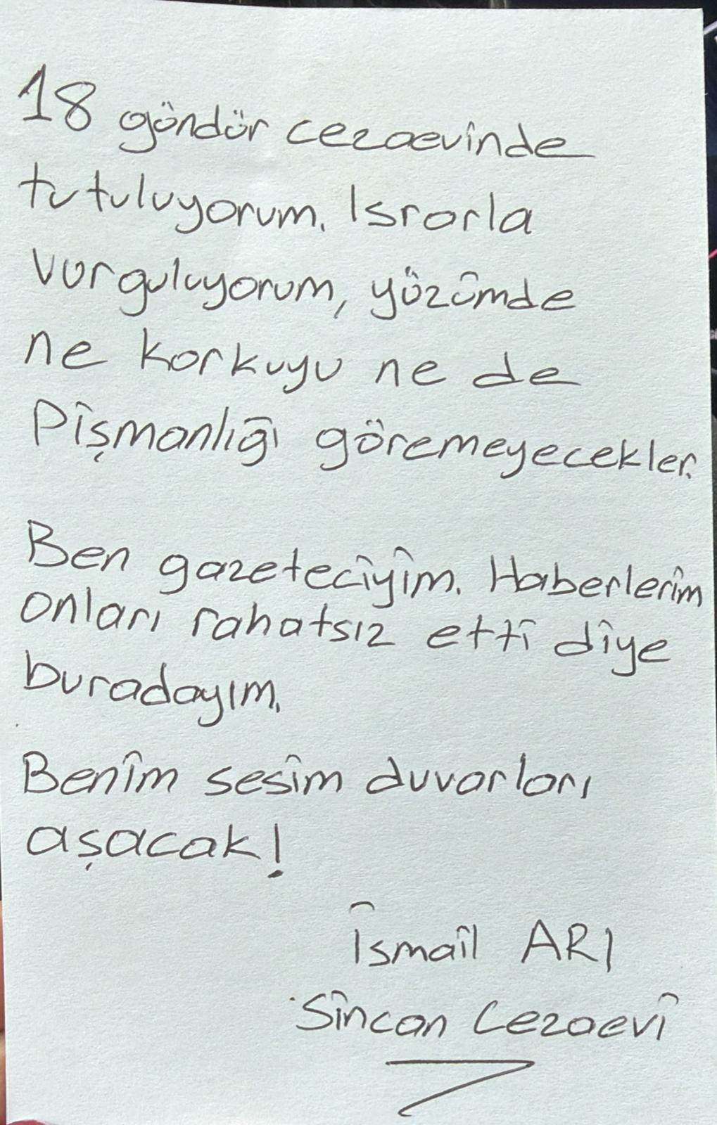 Ben gazeteciyim. Haberlerim onları rahatsız etti diye buradayım. Benim sesim duvarları aşacak. İsmail Arı, Sincan Cezaevi.”