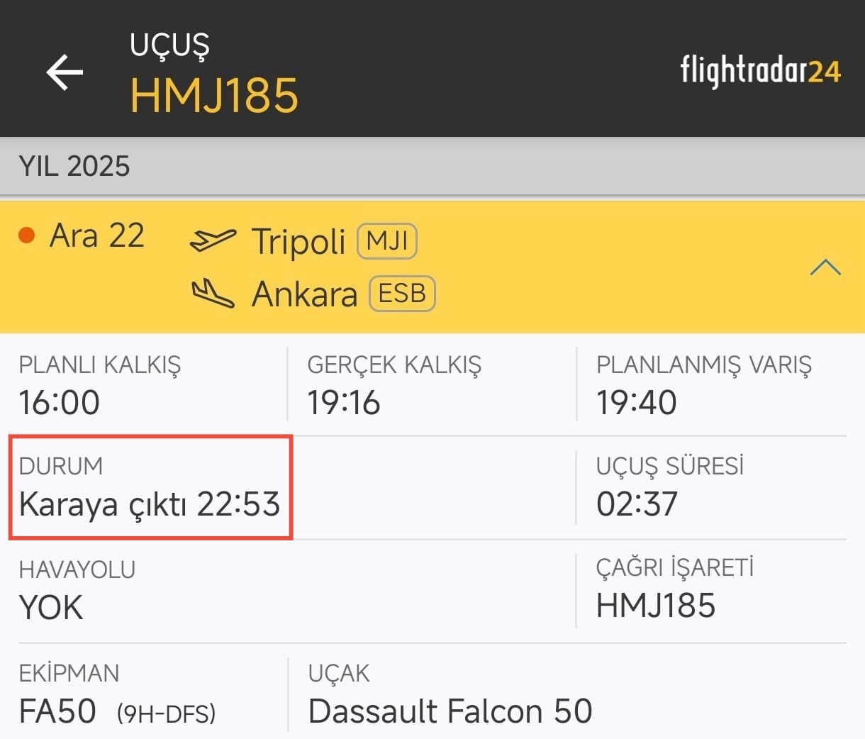 “22 Aralık 2025, saat 22.53: Libya Genelkurmay Başkanı’nı taşıyan uçak Esenboğa’ya iniş yaptı. VIP yolcular 1 numaralı apronda indirildi. Ancak uçak daha sonra 5 numaralı aprona çekildi.