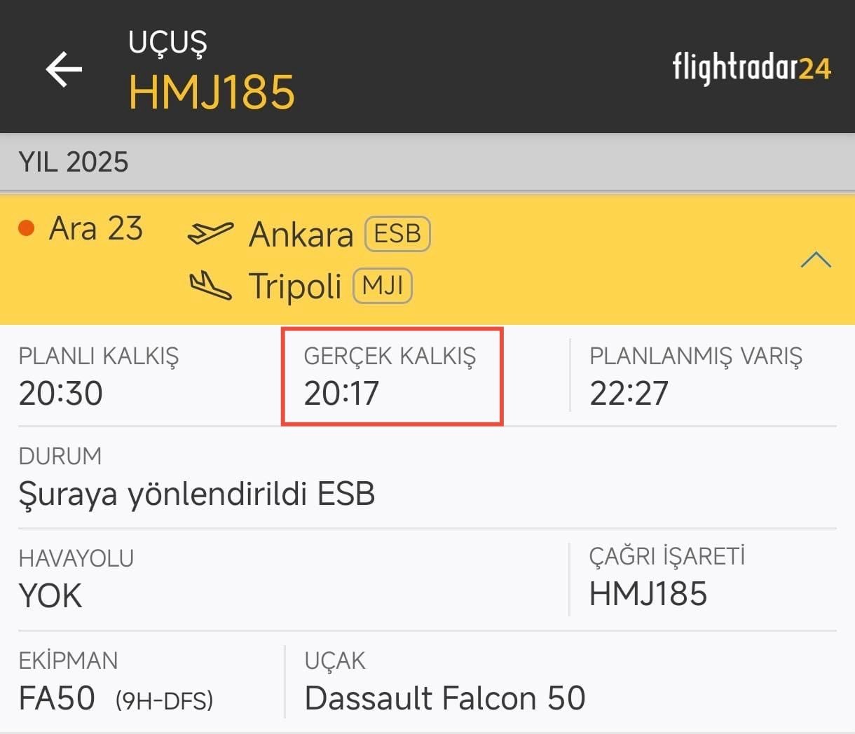 23 Aralık 2025 tarihinde Ankara’da düşen, Libya Genel Kurmay Başkanını taşıyan uçağın, Esenboğa Havalimanı’ndaki kalkışından 3 saat önce;