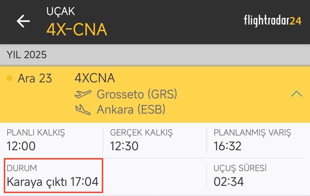 23 Aralık 2025, saat 17.04: İtalya’dan kalkan İsrail bayraklı uçak “yakıt ikmali” için Esenboğa’ya indi ve aynı 5 numaralı aprona yönlendirildi.