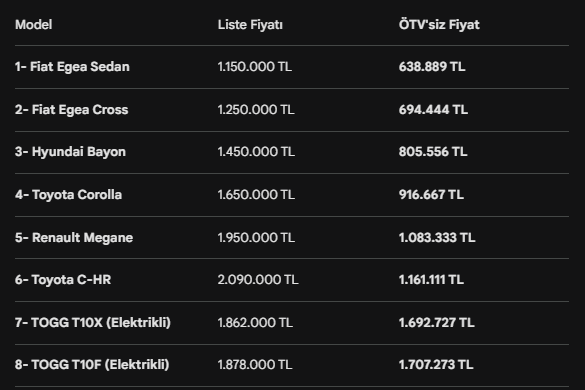 Düzenleme hayata geçtiğinde veya mevcut muafiyet şartlarını taşıyanlar için piyasadaki en avantajlı modeller ve ÖTV’siz fiyat listesi şu şekilde şekilleniyor: