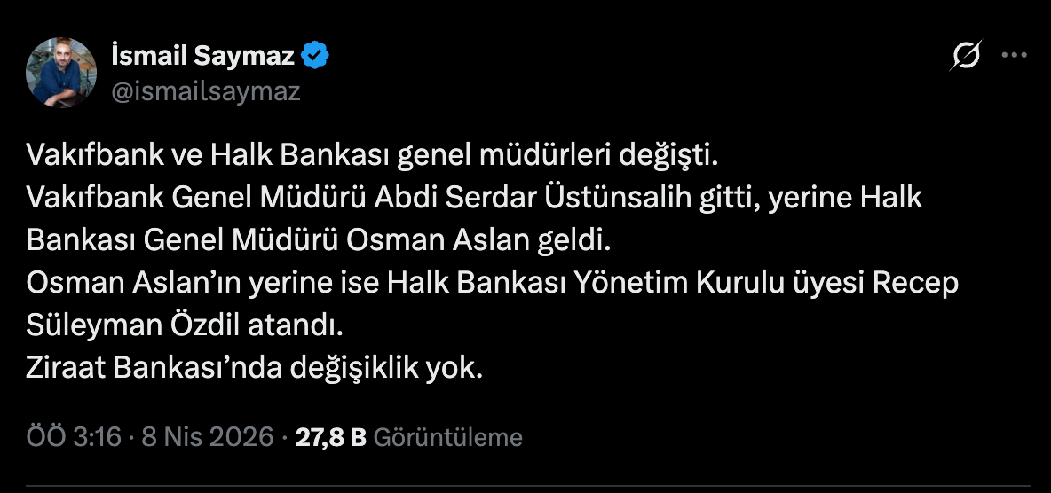 Aynı paylaşımda, Ziraat Bankası’nda herhangi bir genel müdür değişikliğinin yaşanmadığı belirtildi. Saymaz, üç kamu bankasından sadece ikisinde yönetim değişikliğine gidildiğini aktardı. Bankalardan konuya ilişkin henüz resmi bir açıklama yapılmadı.