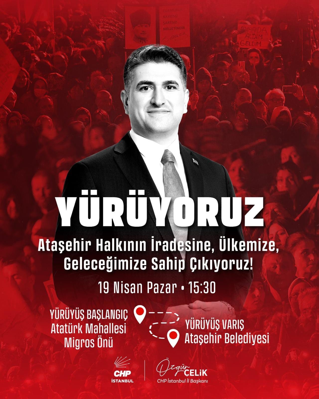 Çelik, “Bu ablukaya teslim olmayacağız. Halkımızın iradesine, Ataşehir’e ve Onursal Adıgüzel’e sahip çıkmak için meydanlarda olacağız” ifadeleriyle duyurduğu yürüyüşün, 19 Nisan saat 15.30’da Ataşehir Atatürk Mahallesi Migros önünde başlayacağını belirtti.