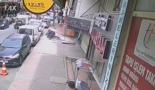 Söz konusu görüntülerde tabelayı takmaya çalışan işçiyle tabelanın kaldırıma düştüğü anlar görülüyor. Bu sırada kaldırımda bekleyen kişi ise, tabelanın altında kalıyor.