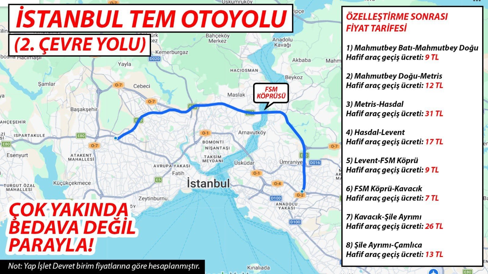 CHP Genel Başkan Yardımcısı Deniz Yavuzyılmaz, sosyal medya hesabı üzerinden yaptığı açıklamada, İstanbul’da kamunun ücretsiz olarak işlettiği TEM Otoyolu’nun (O-2 No’lu İstanbul 2. Çevre Yolu) 25 yıllığına özelleştirilerek ücretli hale getirileceğini öne sürdü.