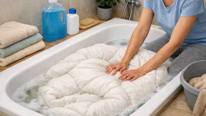 Eğer yorgan makineye sığmıyorsa, geniş bir küvet veya havuzda el ile yıkamak da bir alternatif.